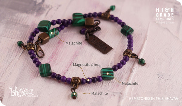 Gemstones:Purple Magnesite 4mmGreen Malachite 8mm, 4mm, 6x9mmMetal Findings:Antique Bronze Plating Zinc Alloy Base Spacer, Connector, Lobster Clasp